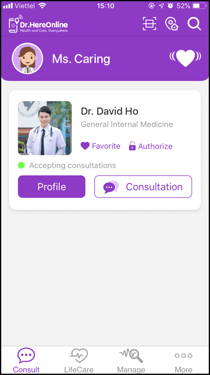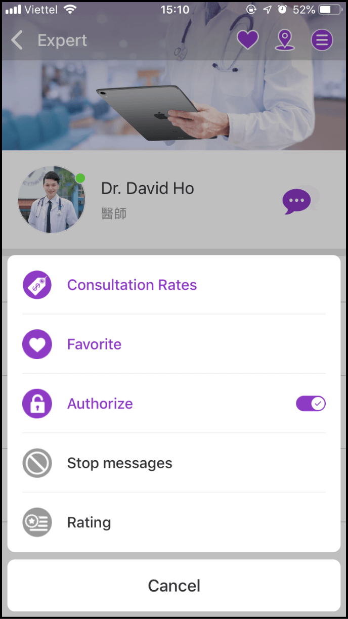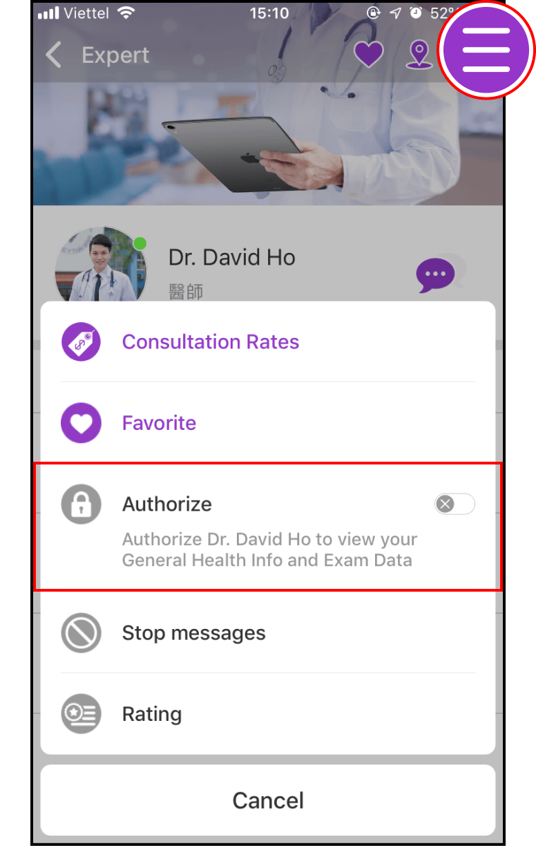 Log in to the app's home screen and locate the Expert/Clinic in your contact list. Click on the avatar or the name of the Expert/Clinic whom you wish to grant access to your health information.