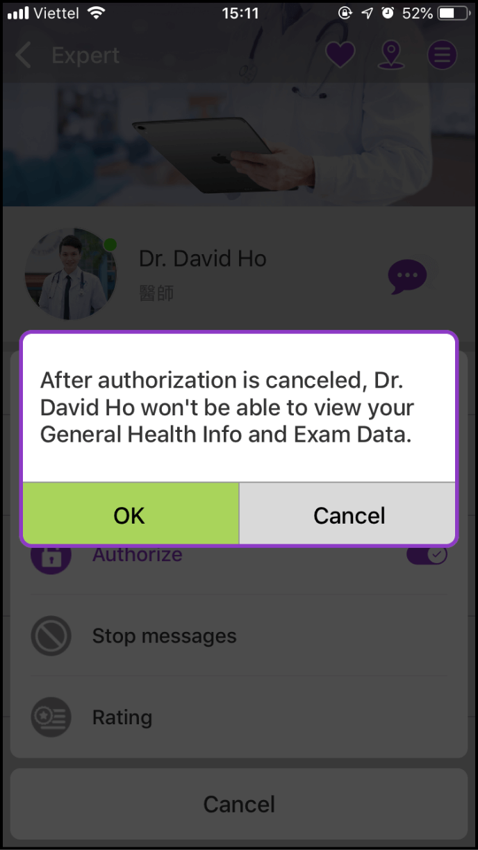 Access the profile page of the Expert/Clinic for whom you wish to cancel authorization, and click the Menu icon in the top right corner. Select the third option - Authorize, and click OK when the next window appears.