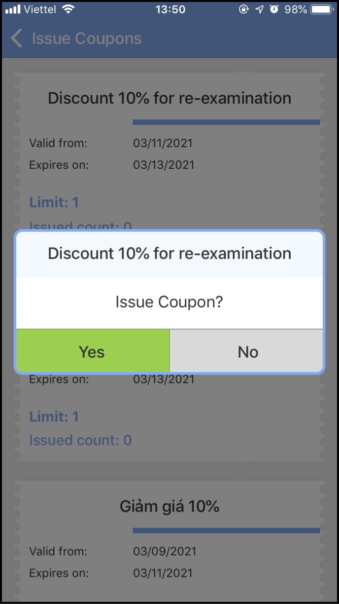 Open the app and select the desired member from the main screen. After accessing their profile, tap Issue Coupons in the bottom corner