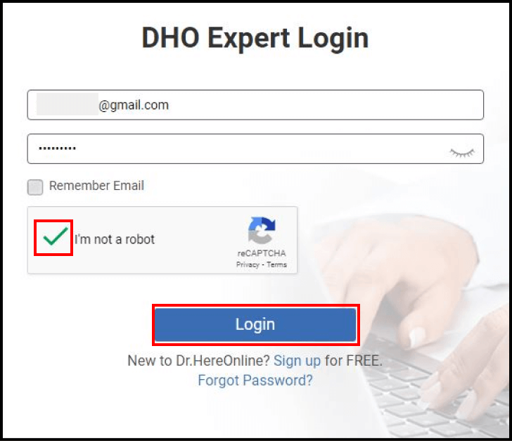 Visit the Dr.HereOnline website at https://www.dochereonline.com. Click Login in the upper right corner of the screen and choose DHO Expert Login