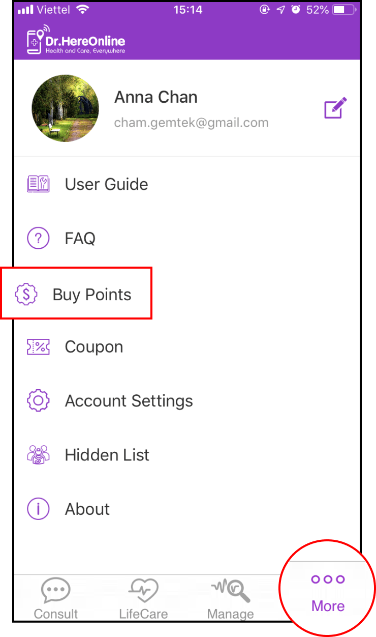 Click More in the bottom right corner of the main screen and choose "Buy Points."