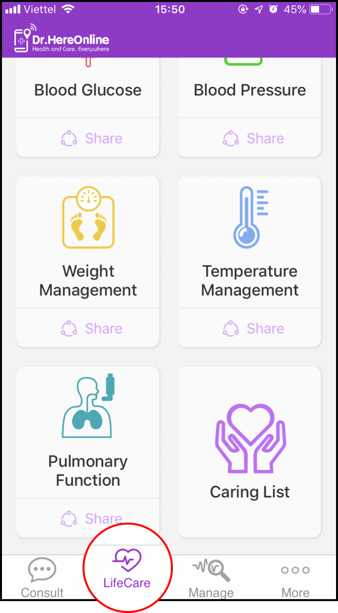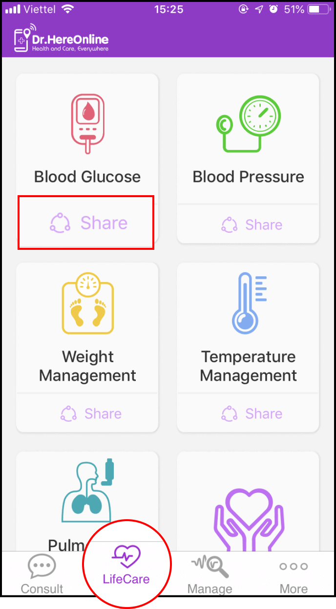 Click LifeCare in the main screen, and select Share below each measurement category.