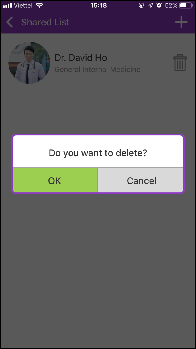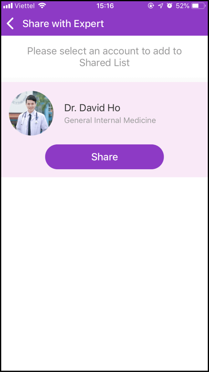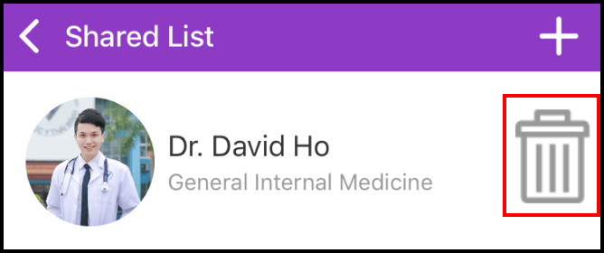 Click the + sign in the upper right corner of the Shared List screen to select a health professional, and click OK after you have done so.