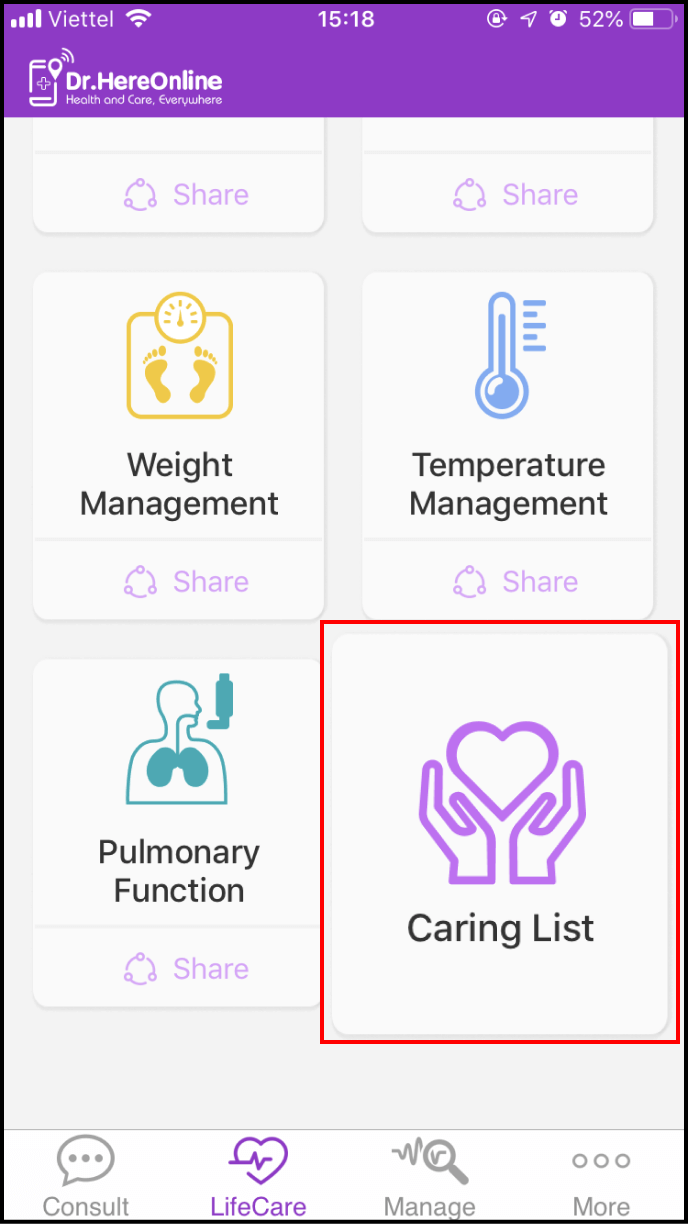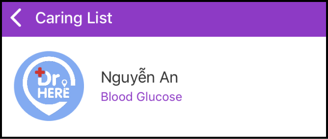 Click on the Caring List in the LifeCare screen to view the blood glucose and blood pressure values of members who have shared their measurements with you.