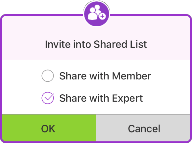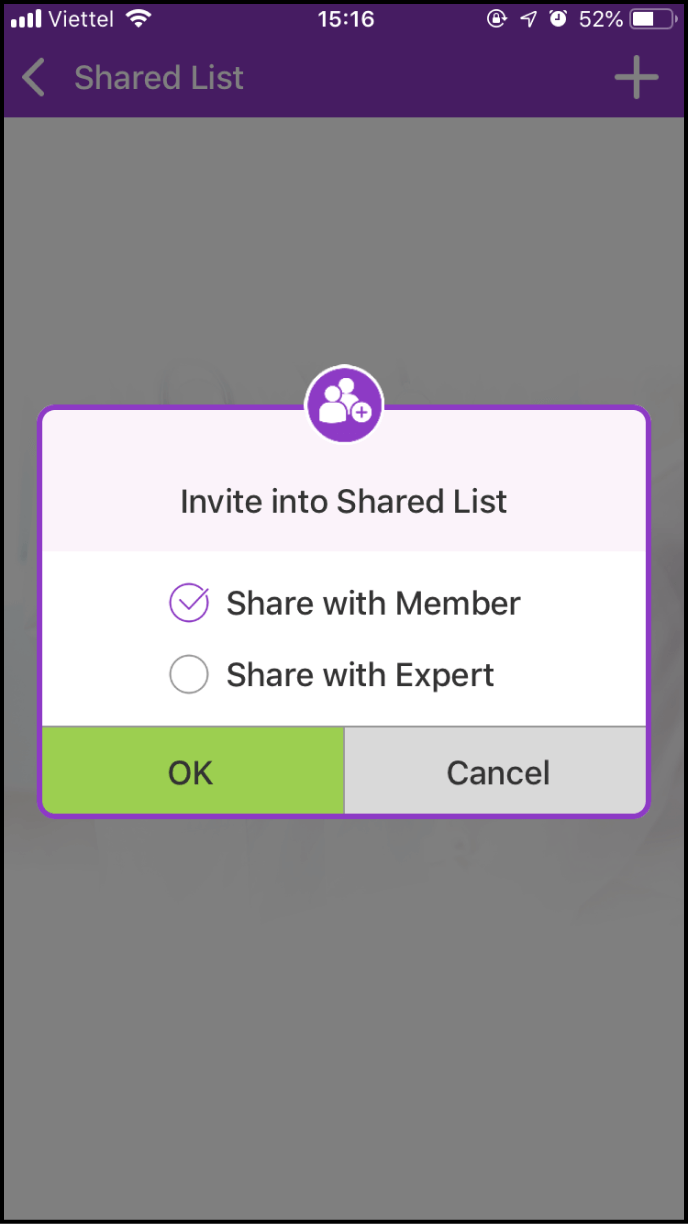 Click the + at the top right corner of your Shared List. In the invitation window, check "Share with Member" and click OK.