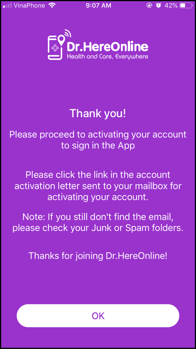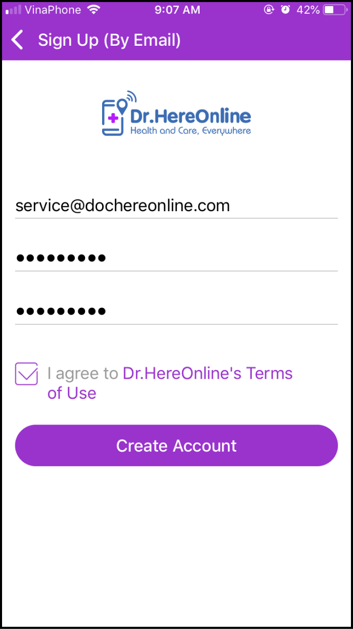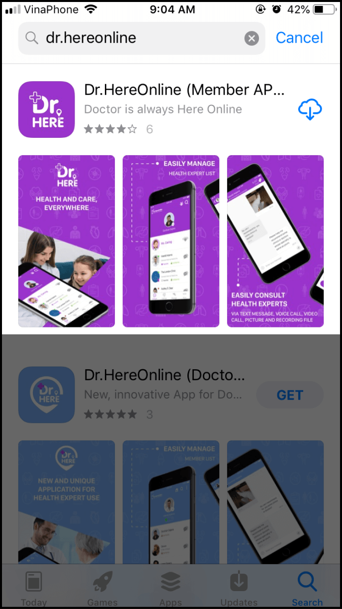 Please go to the App Store on your mobile phone and type "Dr.HereOnline" in the search area. Select the purple Dr.HereOnline Member App to download